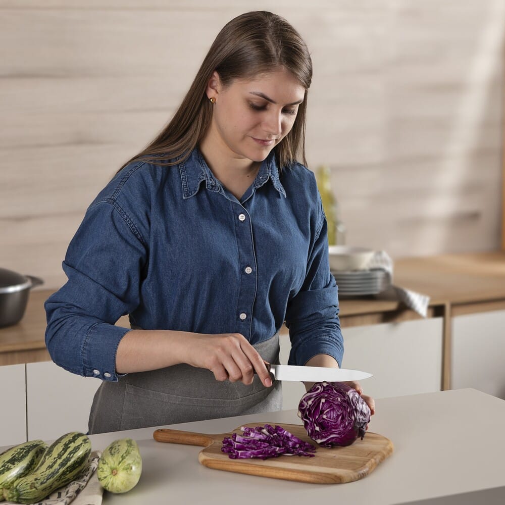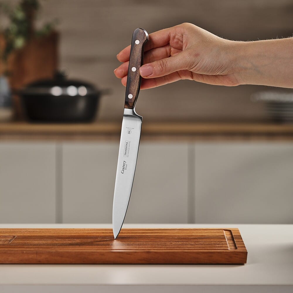 Нож универсальный Tramontina Century Wood 21540/196 сочетает кованое лезвие и деревянную рукоять с надёжной фиксацией, обеспечивая стабильный и контролируемый рез при работе с различными продуктами.