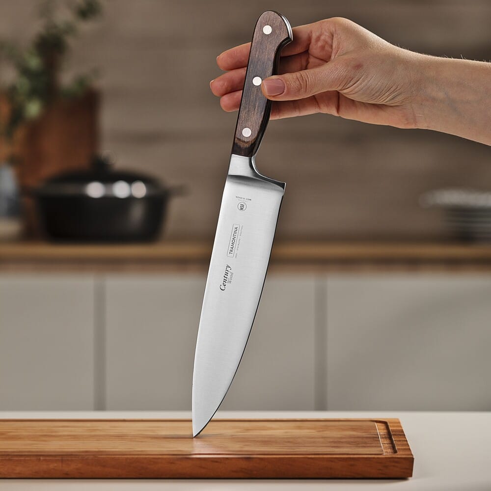 Нож поварской Tramontina Century Wood 21541/198 сочетает кованое лезвие и деревянную рукоять с надёжной фиксацией, обеспечивая стабильный и контролируемый рез при работе с различными продуктами.