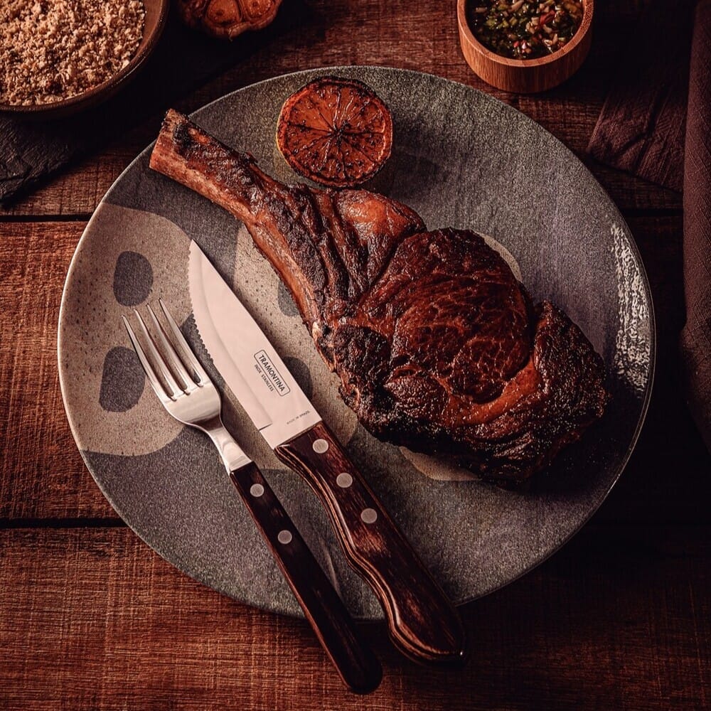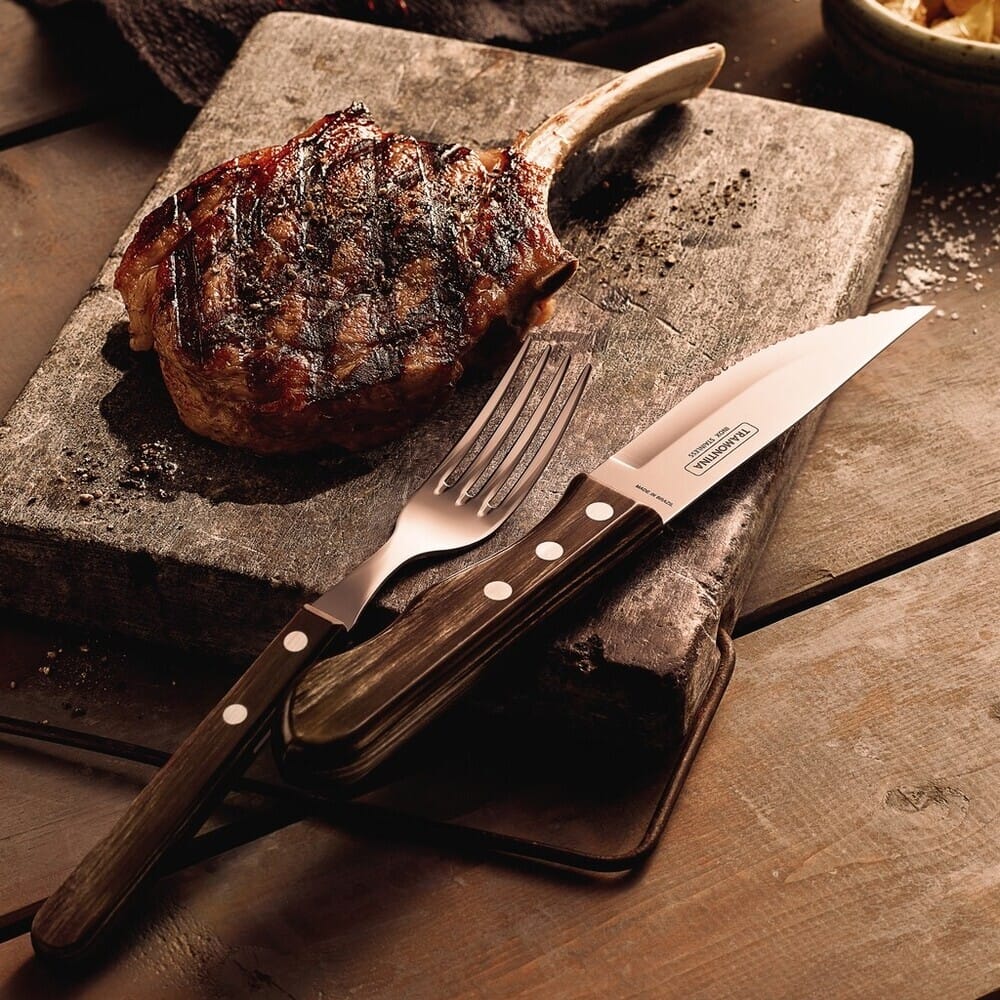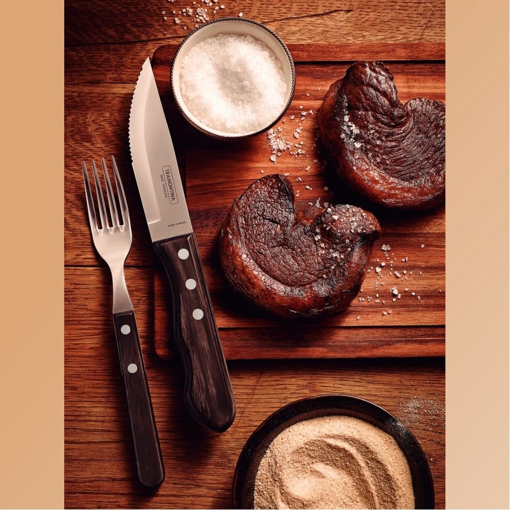 Нож столовый серрейторный Tramontina Polywood 21116/095 сочетает нержавеющее лезвие и деревянную рукоять с надёжной фиксацией, обеспечивая стабильный и контролируемый рез при нарезке мяса и других продуктов.